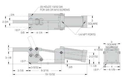 Heavy-duty air clamp with a solid steel clamping arm. Similar to a vertical-handle toggle clamp, except operated by an air cylinder instead of by hand. Toggle linkage provides high holding capacity and insures positive mechanical locking even if air pressure fails. Clamping arm opens 83?. Solid arm can be tapped to accept a spindle, or otherwise modified. 5000 lbs holding capacity. This clamp is operated by a 2-1/2"-bore double-acting air cylinder, with Buna-N seals for -20? to +200?F operating temperature. Two 1/4-NPT ports. 100-psi maximum input air pressure exerts 1600 lbs maximum clamping force at center of arm.