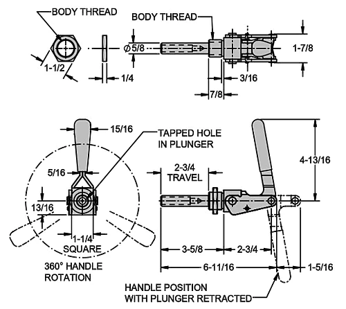 Compact plunger clamp for mounting through panels, plates, or angle brackets. Install in a 1"-diameter drilled hole or a 1"-14 tapped hole (M27x2 in metric), securing with the locknut provided. Rotate clamp to position handle anywhere within 360?. Standard tapped-plunger version locks in extended or retracted position. 2-5/8" plunger travel. Plunger is tapped to accept any 3/8-16 spindle (M10 in metric). Optionally available with patented self-adjusting plunger. 700 lbs holding capacity.