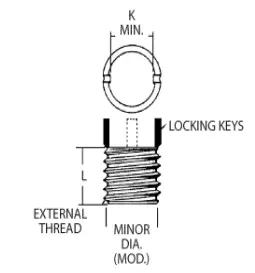 Solid Key Inserts are ideal for relocating a drilled or tapped hole. This threaded plug installs quickly, and the locking keys positively prevent the insert from rotating. Solid Key Inserts are available in a wide range of inch and metric external thread sizes. Metric sizes are shown here, ranging from M8 to M30x2. Key Inserts are installed using standard drills and taps, but the required tap-drill size is slightly larger than normal for that OD thread size.