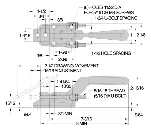 Versatile latch clamp with a threaded U bolt for adjustability. Large, comfortable handle grip. 2-1/2" drawing movement. Threaded U bolt allows a 15/16" adjustment range. Available in steel or stainless steel. Supplied with matching latch plate. Optionally available with safety-lock feature. 2000 lbs holding capacity.
