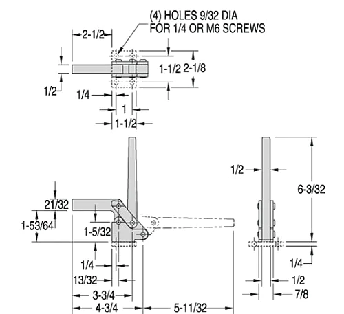 Heavy-duty toggle clamps with a machined steel handle and clamping arm. Simple, easy-opening toggle clamps with extra arm height. Arm opens 83? while handle moves 83? ? ideal when wide opening is not desirable. Solid arm can be tapped to accept a spindle, or otherwise modified. 1500 lbs holding capacity.