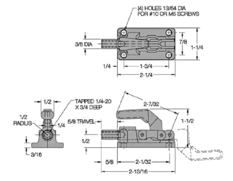 Tiny yet extremely powerful plunger clamp with a forged steel base. Requires very little mounting space due to its narrow base and compact low profile. Locks in extended or retracted position. 5/8" plunger travel. Plunger is tapped to accept any 1/4-20 spindle (M6 in metric). Available in in steel or stainless steel. Optionally available with our safety-lock feature. 300 lbs holding capacity.