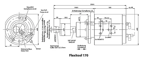 The FLEXITOOL is designed for the efficient deburring of bore-intersections and bore surfaces. Drills or reamers can be inserted without problems in bores due to the Floating chuck. The floating chuck can compensates radial and angular misplacement errors between bore and tool axis when inserting the drills or reamers. The FLEXITOOL 170 is axially movable. The necessary feed forward force can be set by the program control. Because of that the drill or the reamer is freely compliable in all directions.