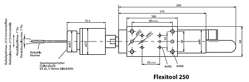 The FLEXITOOL is designed for the efficient deburring of bore-intersections and bore surfaces. Drills or reamers can be inserted without problems in bores due to the Floating chuck. The floating chuck can compensates radial and angular misplacement errors between bore and tool axis when inserting the drills or reamers. The FLEXITOOL 170 is axially movable. The necessary feed forward force can be set by the program control. Because of that the drill or the reamer is freely compliable in all directions.