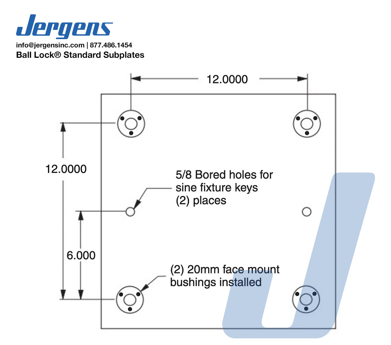 Jergens Ball Lock? Standard Subplates are equipped with (4) 20mm Ball Lock? Face Mount Receiver Bushings for use with 14" x 14" (350mm x 350mm) or 16"x16" (400mm x 400mm) fixture plates. Ideal for horizontal machining centers or multiple pallet machining centers.